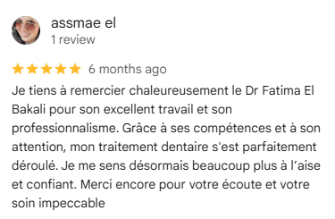 Dr. Fatima El Bakali a transformé mon sourire ! Résultats impressionnants et soins de qualité. Je recommande vivement ce cabinet dentaire pour leur professionnalisme.